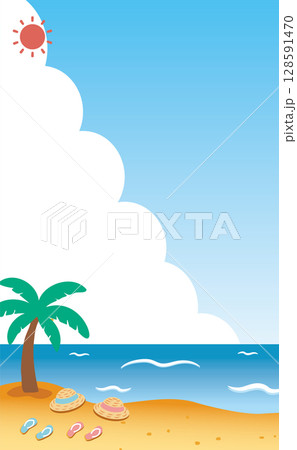 海辺に広がる夏の背景イラスト(麦わら帽子とサンダル)縦型_背景色あり03