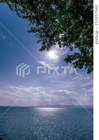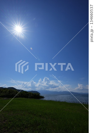 真夏の太陽と琵琶湖の情景