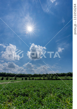 夏の豆畑と青空のコピースペース
