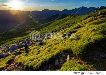 北アルプス・双六岳稜線から見る朝日と槍ヶ岳