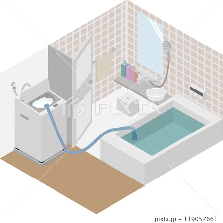 アイソメトリックなお風呂の残り湯を洗濯機に再利用しているイメージ素材