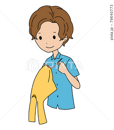 服の破れを縫い直す男の子のイラスト