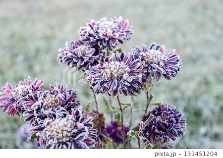 Close up of purple aster flower covered with hoarfrost. Early winter morning nature phenomenon.