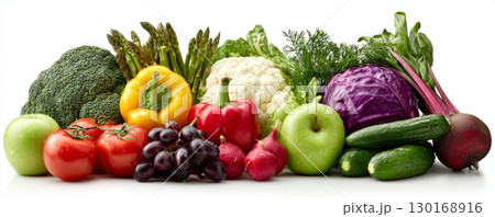 Fresh colorful vegetables and fruits including broccoli bell pepper tomatoes grapes radish apple cucumber and cabbage arranged on white background
