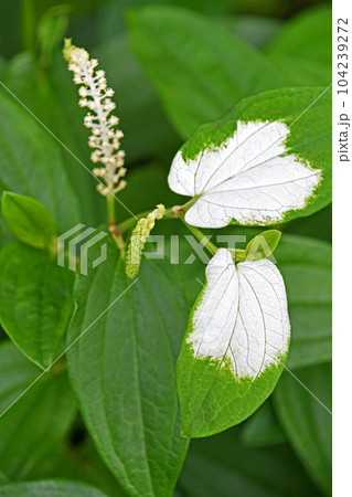 梅雨の頃に咲くハンゲショウの白い葉っぱと花