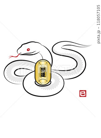八の字にとぐろを巻いて金の小判を持っている縁起の良い白蛇のイラスト 墨絵風でお洒落な巳年の年賀状素材