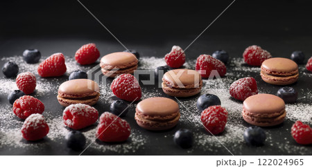 macaroons of different colors on a black background