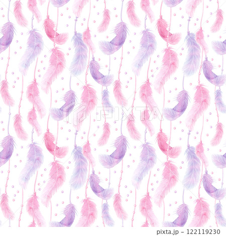Delicate pink, lilac watercolor feather with ribbon beads seamless pattern for girly baby decor, Valentine's Day, wedding. Concept love. Hand drawn illustration white background. Textile, print