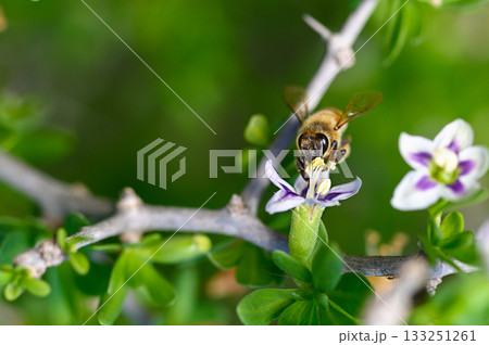 Busy bee collects nectar from delicate flowers in vibrant greenery