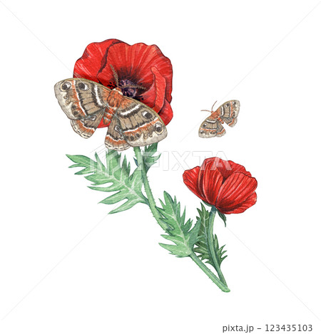 Red poppies with moths isolated on a white background. Watercolor illustration of meadow flowers and insects. Botanical plants. The Provencal style. The French motif. Suitable for postcards, floral.