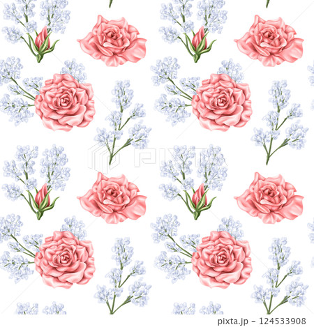 Seamless pattern of delicate blue gypsophila branches, pink roses and buds. Dried wildflowers, bouquets. Botanical motifs, decorative natural elements. Digital illustration