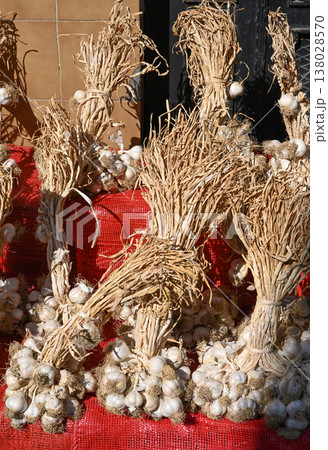 Large, intertwined bunches of dried garlic