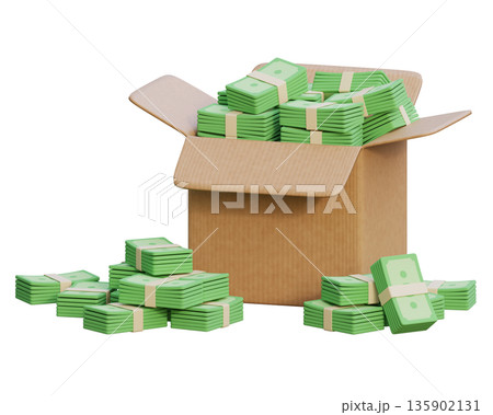 3D rendering of stacks of cash bundles inside a cardboard delivery box