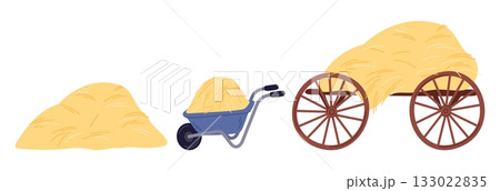 Collecting and transporting hay using garden cart and large wooden wagon. Farming haylofts. Livestock forage. Ranch haycock. Trolley for draw straw. Vector agriculture rustic elements set