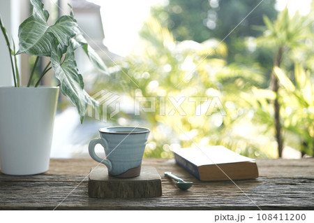 Small cup of coffee and notebooks and Peperomia Hope plant