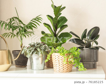 Various home plants - sansevieria, peperomia rosso, tradescantia on a gray table close-up