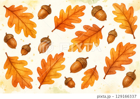 どんぐりと紅葉の秋のパターンイラスト(水彩)