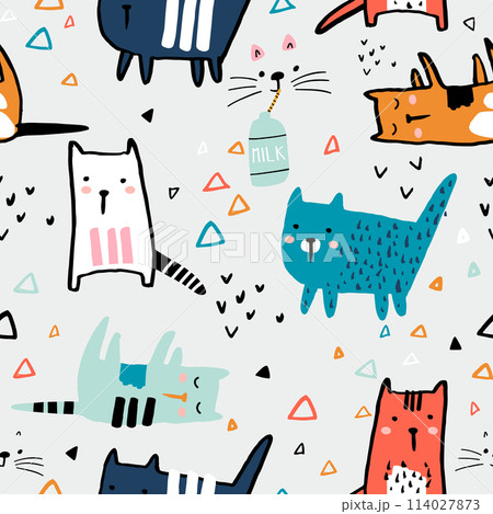 Seamless childish pattern with ink drawn cats in different poses. Creative kids hand drawn texture for fabric, wrapping, textile, wallpaper, apparel. Vector illustration