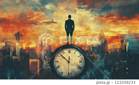 Modern Art Collage: Businessman On Clock Representing Time Management For Personal And Professional Growth, Career, Motivation, Projects, Deadlines, And Leadership