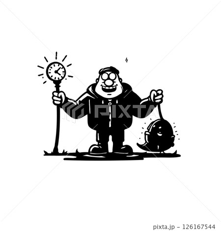 Humorous character interacting with a sentient object and clock in stylized illustration
