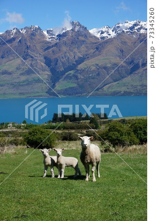 ニュージーランドの羊の親子 美しい山と湖を背景に