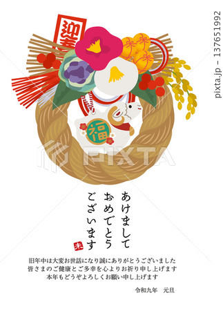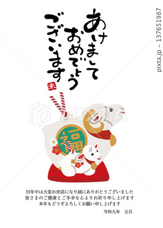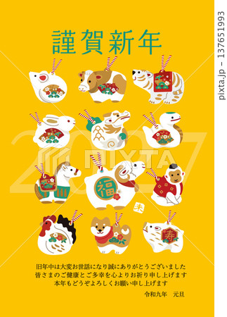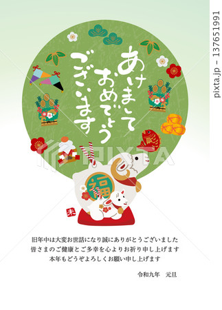 未年の年賀状デザイン 羊と十二子の土鈴の和風年賀はがきテンプレート