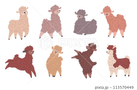 Set of colorful cute llamas in different poses, vector isolated cute funny curly fur Lama animal, cheerful sheep