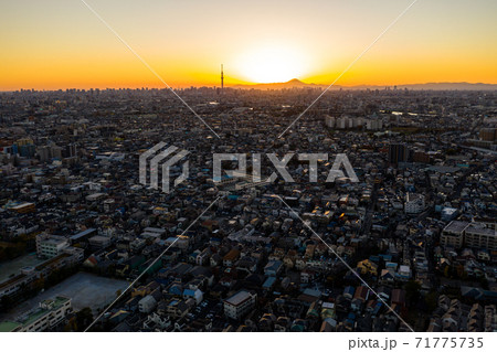「千葉県」都心の美しい夕景を江戸川から空撮