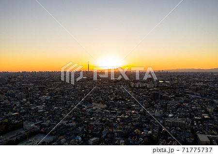 空撮「千葉県」都心に沈む夕日とを江戸川上空から望む