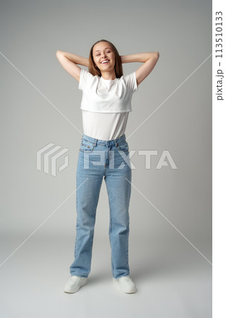 Young happy smiling woman on a gray background