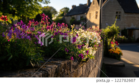 vibrant display of flowers along stone wall in village
