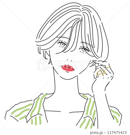 髪の毛を触りながら見つめる綺麗な女性の上半身の線画イラスト