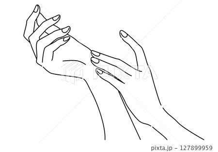 繊細な指先が手首に優しく添えられた白背景の線画イラスト