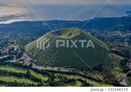 城ヶ崎海岸の断崖と青い海を見下ろす空撮風景