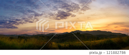 Morning time of panorama mountain under dramatic twilight sky and cloud. Nightfall Silhouette mountain on sunset.