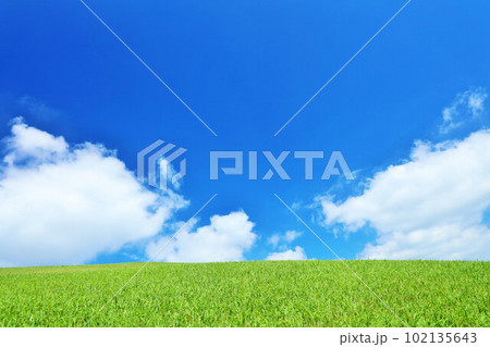 夏の青空と新緑の草原風景
