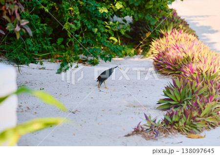 A black bird walks among flowers and trees on the island of Maldives at sunset