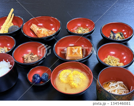 ブルー背景に盛り付けられた正月料理と南天のワンプレート(和風・新年)