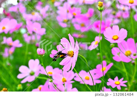 秋の野原に咲くコスモスの花の蜜を吸うホシホウジャク