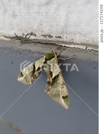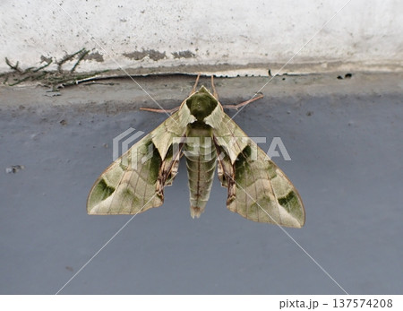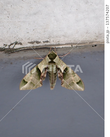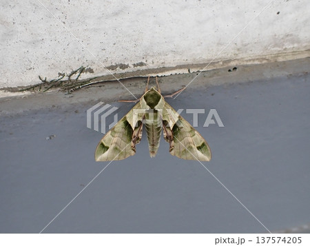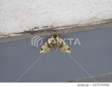 Convolvulus hawk-moth disguised against a gray concrete wall