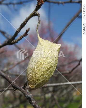 梅の枝に付いた「ウスタビガ」の繭(早春の状態)
