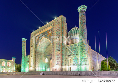 ウズベキスタンのサマルカンドにあるレギスタン広場のとても美しい夜景風景