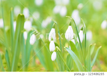 家の周りの草花 四季の色々 早春の白い妖精 白い小さな花が朝日に輝いて咲いています スノードロップ