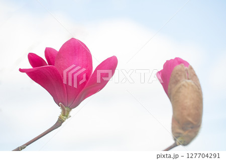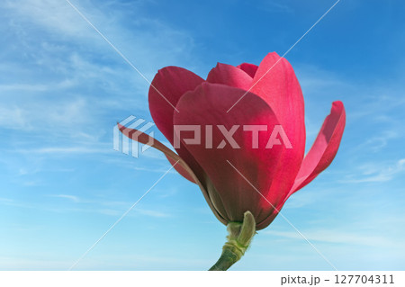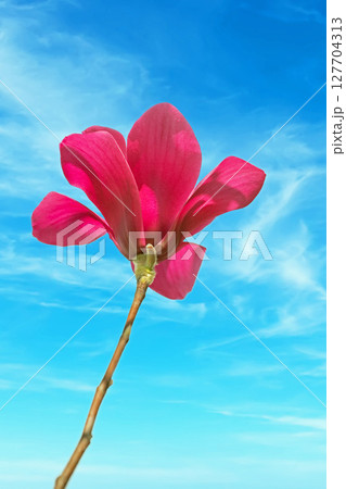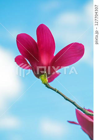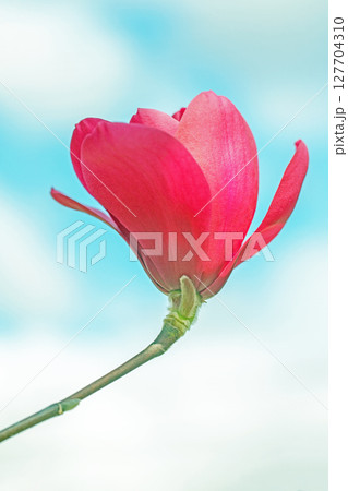 家の周りの草花 四季の色々 春の青空に映える赤いモクレンの花が咲きました