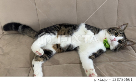 ソファーでくつろぐ二匹の猫、桃ちゃんと銀ちゃん