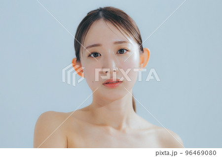 日差しが差し込むブルーバックでスキンケアをする若い女性