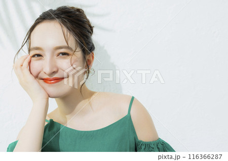 首に手を当てている若い女性。白い背景に白いタンクトップを着ている。