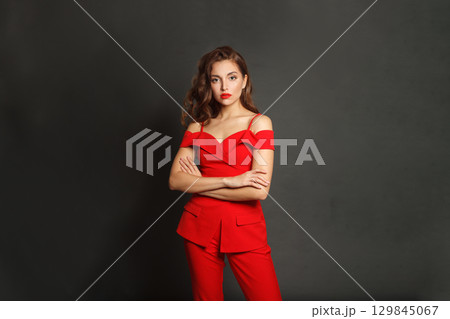 beautiful sexy girl in a red dress posing on the background of a wall in a photo studio