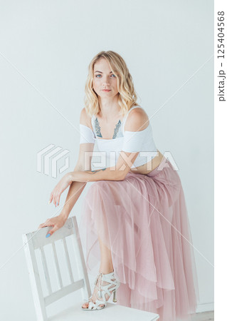 Elegant woman in light blue skirt and T-shirt on white background. Fashionable female style. Studio photography. Vertical photo. High quality photo