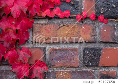 Red ivy creeper on a brick wall with copy space, autumn seasonal background